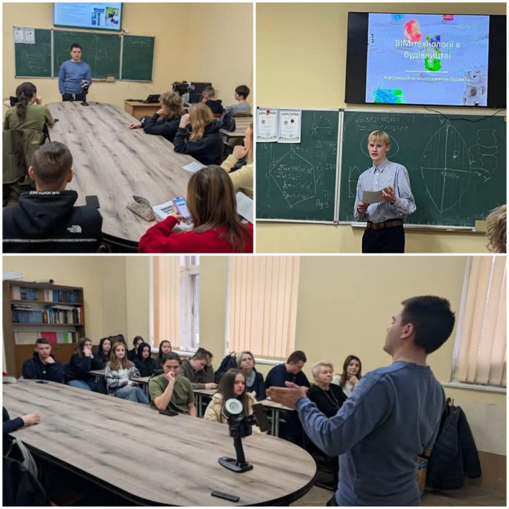 Здобувач освіти групи Г-41 Михайло ДЕНИСЯК виступив із доповіддю «Топографічне знімання з допомогою новітньої технології SLAM (Simultaneous Localization and Mapping)», у якій розповів про переваги використання цієї технології для швидкого та ефективного збору просторових даних. Здобувач освіти групи Г-31 Павло КОСІК представив доповідь на тему «Застосування ВІМ-технологій у будівництві», зосередивши увагу на ролі геодезиста в створенні та веденні BIM-моделі, а також на точності геодезичного забезпечення будівельного процесу.