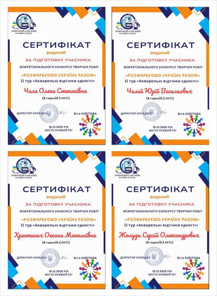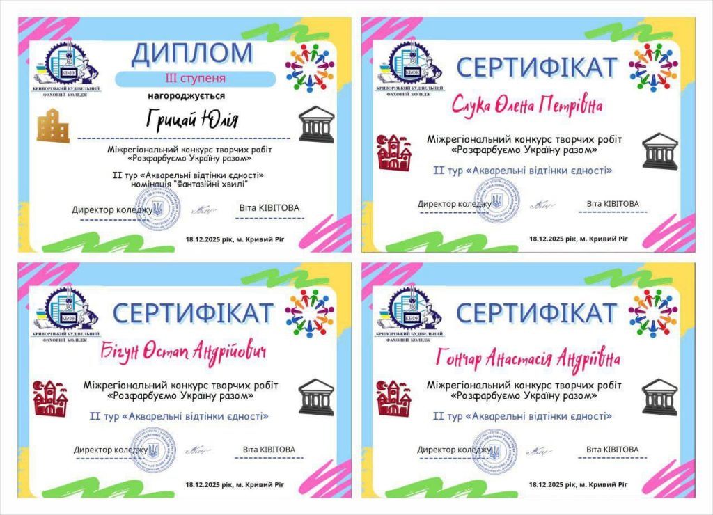 18.12.2025 р. студенти нашого Львівський фаховий коледж будівництва, архітектури та дизайну Грицай Ю., Гончар А., Бігун О., Слука О. під керівництвом викладачів циклової комісії мистецьких дисциплін Юрій Чалий, Олена Чала, Оксана Христинич та Сергія Жолудя взяли участь у ІІ турі «Акварельні відтінки єдності» Міжрегіонального конкурсу творчих робіт «Розфарбуємо Україну разом».